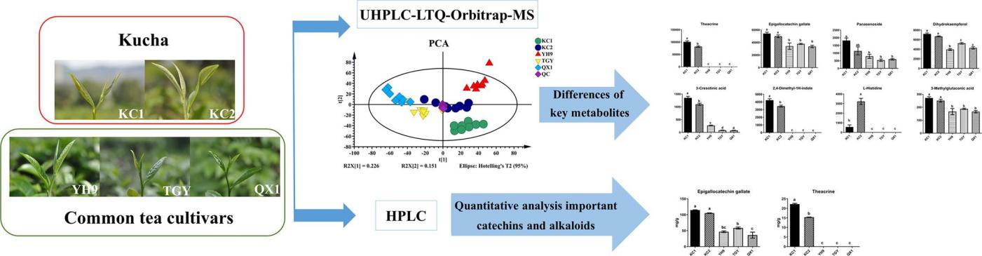研究結果:采用非靶向代謝組學方法,研究了苦茶的代謝物。結果表明,2個苦茶品種與3個對照普通茶品種之間共鑒定出90種差異代謝物。其中,茶苦堿等8種代謝物在KC1和KC2中的含量均顯著高于對照品種。這些化合物中的大多數都是導致苦茶苦味的重要因素。基于高效液相色譜的定量分析結果與LC-MS分析結果相似,表明苦茶中茶苦堿和EGCG含量高于對照品種。此外,研究數據還表明,苦茶的強烈苦味可能是兒茶素、生物堿、黃酮醇和黃酮醇/黃酮苷、氨基酸和酚酸的綜合作用的結果。為進一步研究苦茶的苦味和營養特性提供了理論依據。