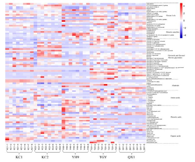 不同茶葉KC1、KC2、YH9、TGY、QX1代謝產物的熱圖