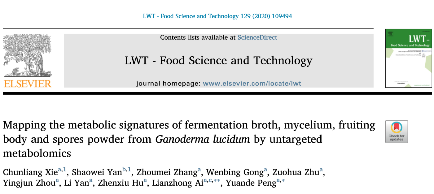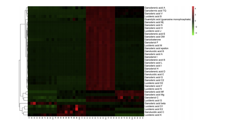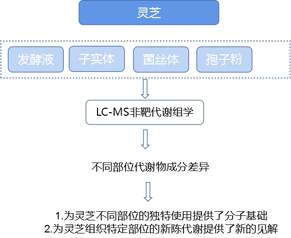 研究結果:這項研究運用靈芝的不同部分,通過非靶向代謝組學研究靈芝不同部位的功能和藥效。根據非靶向代謝組學的結果,得出子實體可以特別用作抗腫瘤和抗艾滋病藥物;孢子粉可用于開發治療肝病和糖尿病的藥物;靈芝的四個部分可用于抗氧化劑領域。本研究為靈芝的質量評價和綜合利用提供了理論依據。