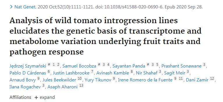 利用野生番茄漸滲系闡明轉錄組和代謝組變異對果實性狀和病原菌響應的遺傳基礎的潛在影響