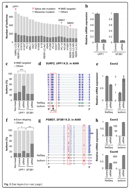 SF3B1是一種眾所周知的剪接因子,在多種疾病中發生突變,并導致異常剪接亞型的增加。作者通過SF3B1敲除評估剪接損傷的影響以及研究剪接因子的畸變是否影響轉錄本的產生。作者發現外顯子跳躍的比例顯著增加(圖3f),例如,PSMD7的外顯子3和6 在敲除后被改變(圖3g)。SF3B1-depleted的A549細胞中,外顯子跳躍亞型的表達PSMD7在中顯著增加,相反,RefSeq類型減少。為了確認剪接位點近端區域的共有序列,作者收集了僅在SF3B1在A549細胞中敲除檢測到的外顯子跳躍異構體。在這項分析中,作者用新的剪接連接的10 bp的區域,并跳過了外顯子。具有外顯子跳躍亞型的基因在翻譯和泛素-蛋白酶體途徑中顯示出顯著的富集,因此,這些因素的中斷可能會改變至少一些異常剪接亞型,并可能導致它們在肺癌細胞中的積累。