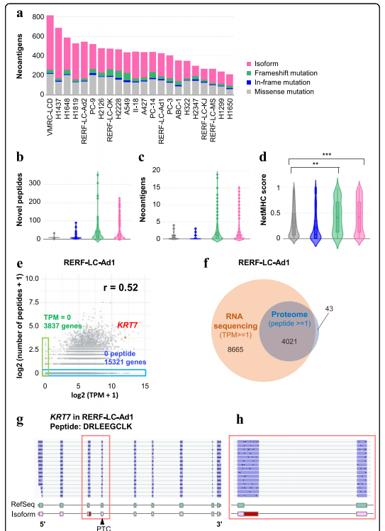 為了從實驗上驗證異常的轉錄本是否被翻譯成蛋白質,對11種細胞系(A427、A549、H1650、H2228、II-18、PC-9、RERF-LC-Ad1、RERF-LC-Ad2、RERF-LC-KJ、RERF-LC-MS和VMRC-LCD)采用了使用液相色譜結合串聯質譜(LC/MS/MS)對于多肽識別,作者基于每個細胞系的MinION數據定制了肽序列數據庫。如前所述,普通轉錄組測序由于其測序能力,顯示出比LC/MS/MS蛋白質組學更高的基因覆蓋率。通過液相色譜/質譜/蛋白質組學檢測的每個基因的肽數與通過轉錄組測序數據計算的TPM相關(r= 0.52,圖4e)而且LC/MS/MS蛋白質組學檢測到的大部分基因也被轉錄組測序覆蓋(圖4f)。作者成功地檢測到7個翻譯自異常剪接亞型特異性區域的多肽。例如,衍生自外顯子3中具有選擇性5’剪接的轉錄本的多肽KRT7存在于RERF-LC-Ad1(圖4g)。在GENCODE數據庫中沒有發現這種轉錄本,但是在ENST00000547613中觀察到了這種同中型特異性連接,其被認為是處理過的轉錄本。MinION也證實了在H1437、H2126和II-18中的表達(表1).此外,這種轉錄本有可能產生幾個新抗原,這些新抗原是由NetMHC預測的。這些結果表明,一些異常剪接亞型被真正翻譯成肽,并可能在癌癥中產生新抗原中發揮作用。