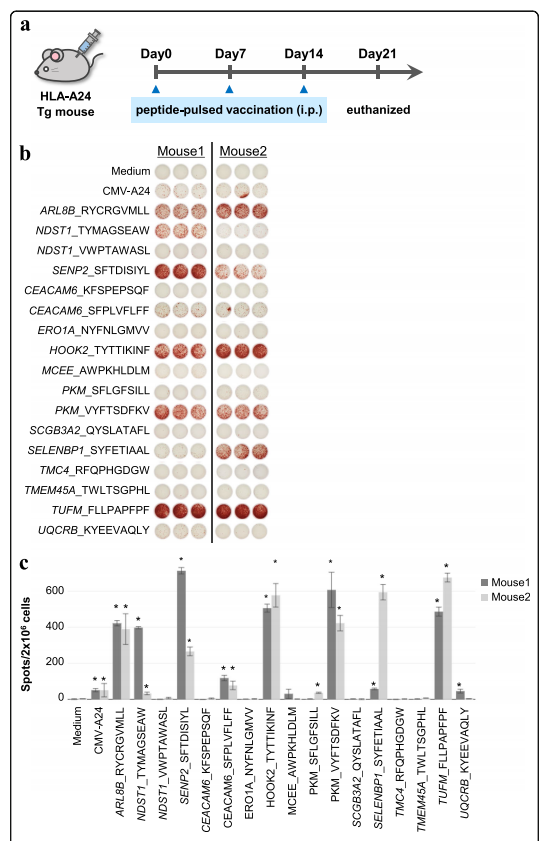 為了評估從異常剪接亞型和移碼突變中鑒定的肽的抗原性,作者根據圖6a所示的方案用候選肽免疫HLA-A24轉基因小鼠。作者根據人類白細胞抗原-α:24:02的網絡MHC評分選擇了17種候選肽(表2)。作者通過BLAST-P證實了該肽序列與人或小鼠蛋白質數據庫中的序列沒有相似性,最后一次接種疫苗一周后,作者從小鼠中分離出脾細胞,并對分離物進行酶聯免疫吸附斑點(ELISpot)分析。通過這樣做,作者試圖檢測新抗原特異性脾淋巴細胞反應。酶聯免疫吸附試驗結果顯示,17個多肽中有8個誘導顯著高的干擾素-γ產生(n= 2)與PBS組和單獨佐劑組相比(圖6b,c)。這些結果表明,來自剪接亞型和移碼突變的多肽可以通過與人類白細胞抗原的相互作用激活T細胞反應。