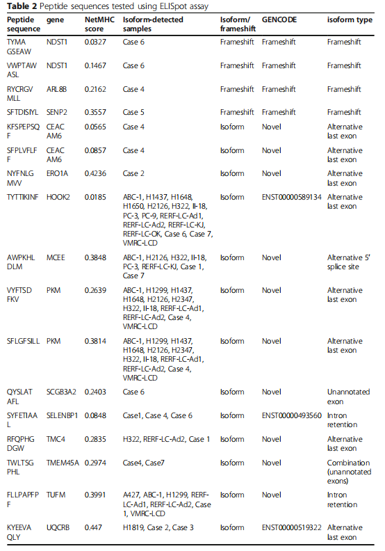 結果:對22組細胞系進行全長轉錄組測序,共鑒定出2021種新的剪接異構體。其中一些異構體的蛋白質表達通過蛋白質組分析進行驗證。無義介導的mRNA衰減因子(NMD)UPF1的降低和剪接因子SF3B1的減少增加了異常轉錄本的比例。NetMHC對每種HLA分子結合的親和力的評估顯示,一些亞型可能產生新抗原候選體,還在7個非小細胞肺癌標本中發現了剪接亞型。酶聯免疫吸附斑點試驗表明,大約一半的候選肽有可能通過與人類白細胞抗原分子的相互作用激活T細胞反應。大約一半的多肽通過與HLA分子的相互作用具有激活T細胞反應的潛力。最后,作者通過參考構建的目錄來估計癌癥基因組圖譜(TCGA)數據庫中的亞型數量,發現NMD因子的破壞與TCGA-Lung Adenocarcinoma數據集中發現的剪接亞型數量顯著相關。