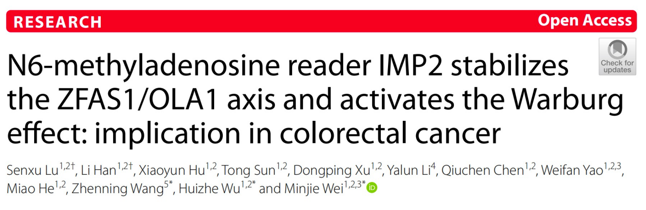 中文名稱:N6-甲基腺苷(m6A)閱讀蛋白IMP2能穩定ZFAS1/OLA1軸并激活沃伯格效應:在結直腸癌中的意義