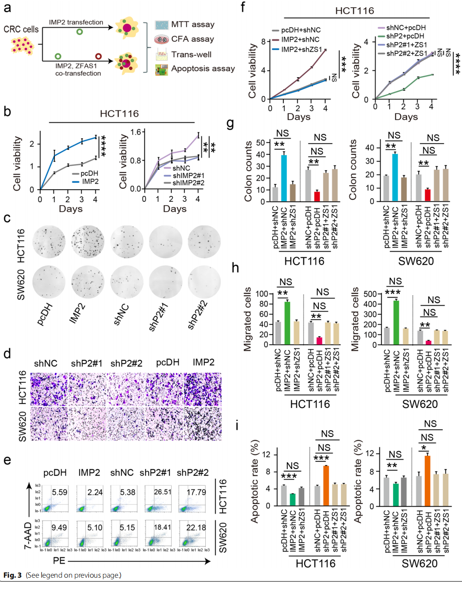 為了進一步明確在CRC細胞中IMP2和ZFAS1特異性的調控模式,首先通過MTT實驗(圖3b)和細胞克隆實驗(CFA)(圖3c)分析了干擾IMP2表達后的HCT116和SW620細胞系的細胞增殖能力和細胞克隆能力。結果發現異位IMP2的表達顯著促進了CRC細胞的生長和克隆能力,而IMP2的耗竭抑制了CRC細胞的增殖。此外還檢測了細胞侵襲能力(圖3d),發現在沉默IMP2時,細胞的遷移受到了明顯的抑制,而IMP2的過表達極大地提高了HCT116和SW620細胞系的侵襲能力。還發現IMP2的敲除增加了CRC細胞的凋亡率,IMP2的過表達會抑制CRC細胞的凋亡率(圖3e)。后續通過拯救實驗表明ZFAS1的過表達逆轉了對CRC細胞的促進作用,包括細胞增殖能力、細胞克隆能力、細胞遷移能力和細胞凋亡率(圖3f-i)。