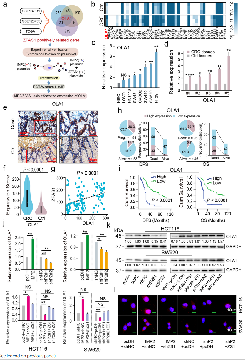隨后采用TMA和IHC檢測OLA1的表達(圖4e),通過RCO曲線評估OLA1的低/高表達,發現與對照組相比,CRC組織中觀察到明顯的OLA1表達,表現出致癌基因的特性(圖4e,f)。且OLA1與ZFAS1的表達存在正相關性(圖4g)。與臨床數據做相關性分析,結果表明OLA1低表達的患者占比較高(圖4h),OLA1高表達的CRC患者的DFS和OS時間明顯縮短了(圖4i)。后續針對OLA1是否是ZFAS1的下游靶點做驗證,IMP2沉默/過表達不僅降低/增加了OLA1 mRNA的表達,而且降低/增加了OLA1蛋白的表達。但是IMP2對OLA1的影響可以被ZFAS2完全逆轉(圖4j-l)。