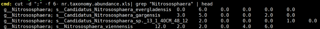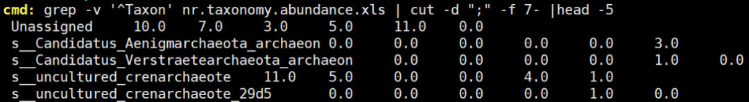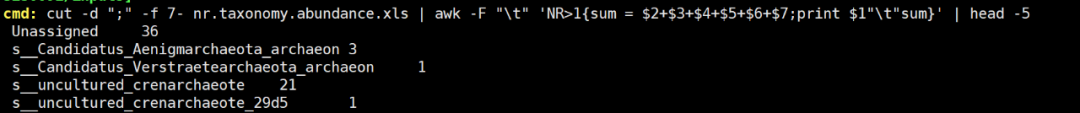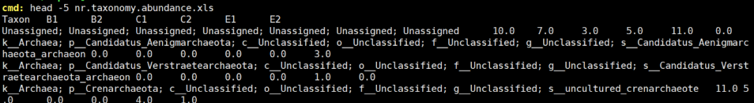 在實(shí)際運(yùn)用過(guò)程中,我們通常根據(jù)需要,通過(guò)管道符“|”同時(shí)使用好幾種生物信息學(xué)Linux命令,避免花費(fèi)大量時(shí)間找軟件、寫代碼,有些情況下可以代替Excel等辦公軟件。如下就是一些linux命令的高級(jí)使用實(shí)例。如下是一個(gè)宏基因組的NR注釋結(jié)果示例文件: