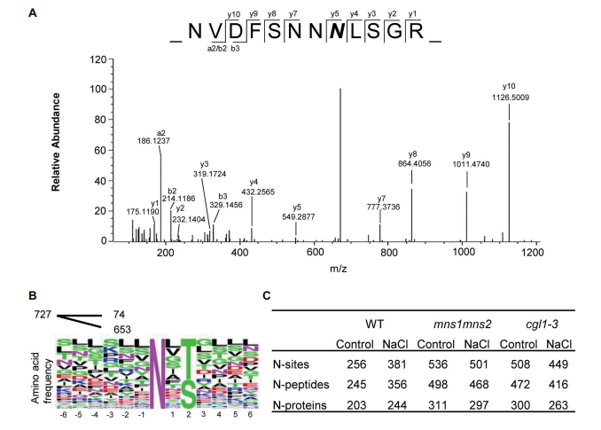 許多證據(jù)表明,植物對(duì)鹽脅迫的適應(yīng)性反應(yīng)需要相關(guān)蛋白上加工成熟的N-聚糖參與。然而,關(guān)于在這個(gè)過(guò)程中起作用的鹽響應(yīng)糖蛋白知之甚少。本研究鑒定了野生型?(WT)擬南芥中的鹽響應(yīng)糖蛋白和兩個(gè)N-聚糖成熟缺陷的突變體mns1?mns2和cgl1。通過(guò)液相色譜串聯(lián)質(zhì)譜?(LC-MS/MS)?進(jìn)行定量分析,共鑒定出97種豐度變化?>?1.5?的蛋白質(zhì)對(duì)抗鹽脅迫。表明N-聚糖對(duì)于調(diào)節(jié)應(yīng)激反應(yīng)蛋白水平至關(guān)重要,并且列出了幾種負(fù)責(zé)擬南芥耐鹽脅迫的新型糖蛋白。