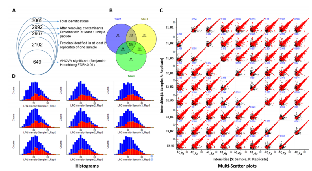 維恩圖分析顯示1702個(gè)蛋白質(zhì)組通常在所有三個(gè)塊莖樣品中鑒定,而89、36和54個(gè)蛋白質(zhì)組分別僅在塊莖?1、2和3中鑒定。此外,塊莖?1?和塊莖?2?共有?112?個(gè)蛋白質(zhì)組,表明它們的蛋白質(zhì)組與塊莖對(duì)?(2,3)?和?(3,1)?相比更密切相關(guān)(圖1?B)。為了檢查同一樣品一式三份中無(wú)標(biāo)記蛋白質(zhì)定量的重現(xiàn)性,使用?Perseus軟件生成多散點(diǎn)圖(圖1?C)。相同樣本的散點(diǎn)圖顯示出典型的非均勻分布,即在較低強(qiáng)度時(shí)較寬,在較高強(qiáng)度時(shí)指向較高。同一樣品的不同重復(fù)的皮爾遜相關(guān)系數(shù)大于0.944,表明同一樣品的三次重復(fù)之間具有高度相關(guān)性。直方圖顯示了缺失值插補(bǔ)前后的蛋白質(zhì)計(jì)數(shù)?(圖1?D)。