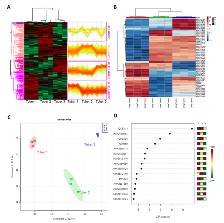 層次聚類分析將差異蛋白分成四個(gè)簇,每個(gè)簇都有不同的表達(dá)譜(圖2?A)。簇1包含61種蛋白質(zhì),在塊莖3中主要下調(diào),而簇1的891種蛋白質(zhì)主要在塊莖2中上調(diào)。簇3顯示塊莖3中豐度增加的379種蛋白質(zhì),而簇4中的771種蛋白質(zhì)在塊莖?1?中顯示最大豐度。顯示前48種差異調(diào)節(jié)蛋白質(zhì)豐度模式的熱圖位于?(圖2?B)。在這48個(gè)DEs中鑒定了多種具有獨(dú)特功能的蛋白質(zhì)。共有19、24和34種DE蛋白受到高度調(diào)節(jié),而塊莖1-3中分別有27、22和14種蛋白質(zhì)降低。結(jié)果表明,塊莖?1?和塊?3?的蛋白質(zhì)含量非常不同,而塊莖2的結(jié)果則參差不齊。此外,偏最小二乘判別分析?(PLS-DA)?將成分?1?中的塊莖1和3分開(kāi),占總方差的32.7%,而成分2中的塊莖2與塊莖1和3分開(kāi),占總方差的?25.5%總方差的百分比?(圖2?C)。最后確定了有助于PLS-DA圖分離的前15種蛋白質(zhì)(圖2?D)。