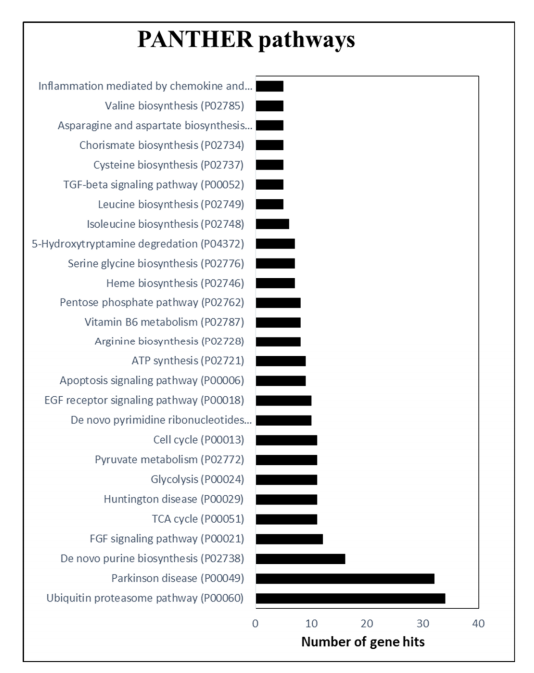 統(tǒng)計(jì)分析后,作者進(jìn)行基于基因本體(GO)的功能分類,在2102種蛋白質(zhì)中,PANTHER?19.0?針對(duì)Helianthus?annus數(shù)據(jù)庫(kù)檢測(cè)到2044種蛋白質(zhì)。接下來(lái),進(jìn)行?PANTHER?通路分析以對(duì)蛋白質(zhì)通路進(jìn)行分類,發(fā)現(xiàn)了大多數(shù)蛋白質(zhì)歸因于泛素蛋白體和核苷酸(嘌呤)生物合成途徑,其次是TCA循環(huán)、糖酵解、丙酮酸代謝、細(xì)胞周期和嘧啶核糖核苷酸途徑。