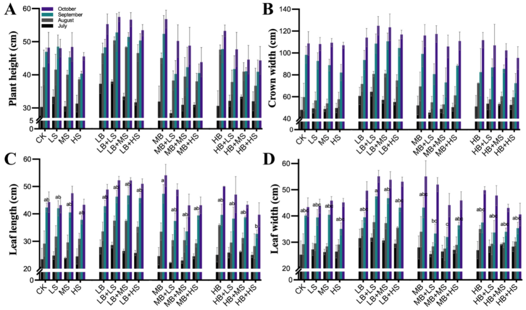 R. palmatum?L.在不同生長時期(7、8、9、10月)的生長參數如圖1所示。與對照組(CK)相比,任意三種濃度的細菌接種劑(LB、MB和HB)處理后的株高、冠寬、葉長和葉寬都有所增加。我們的結果顯示了兩個明顯的倒V形趨勢,在四種含 LB 的處理(LB、LB + LS、LB + MS和LB + HS)中出現了一個外峰。盡管HB處理增加了R. palmatum?L.的生長,但當與蔗糖結合時,它降低了生長,尤其是在 HB + HS 處理下。這表明用高水平蔗糖(15 g/L)修正的高水平細菌接種劑(1.0 ×?107CFU/mL)抑制了PGPM的植物促生長功能。