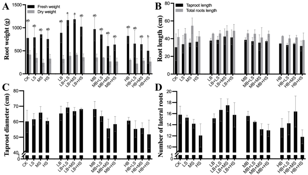 在收獲時,還確定了地塊產量的變化(圖2)。與兩個明顯的倒V形趨勢的生長結果一致,LB + LS和LB + MS處理下的R. palmatum?L.根的鮮重得到了最顯著的改善(圖2A)。我們進一步分析了主根和側根的變化(圖2B-D),發現在LB+MS下獲得最大的根長和側根數,而在LB+LS下獲得最大的主根直徑,這意味著 LB + MS處理刺激側根的數量和長度,而LB + LS促進主根厚度以提高R. palmatum?L.的根重。