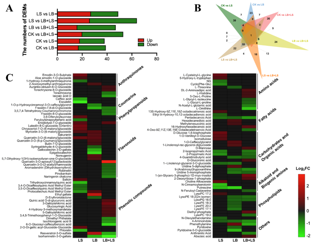 通過VIP(Variable Importance in Projection ) ≥ 1、倍數變化 ≥ 1.5 和 p 值 ≤ 0.05 的篩選標準,顯著鑒定了 38、39、53、47、64 和 49 種差異表達代謝物 (DEMs,Differentially Expressed Metabolites )分別在 CK vs.LS、CK vs.LB、CK vs.LB + LS、LB vs.LB + LS、LS vs.LB + LS 和LS vs.LB(圖4A)。
