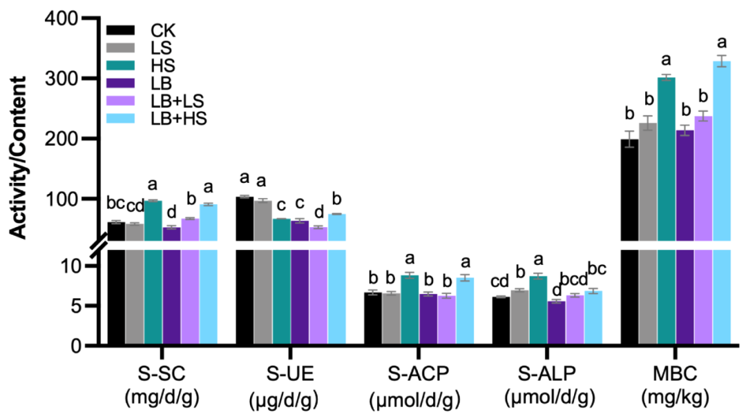 然而,與根際土壤相比,大塊土壤中的硝酸鹽氮(NO3-N)異常高(33.19 ± 2.98 mg/kg),這表明根際微生物對氮的利用率很高。此外,HS根際土壤中有效磷和總磷的量顯著增加,這表明在沒有任何PGPM的情況下添加高蔗糖可能提供了磷轉化所需的碳。LB + LS處理顯著增加了總鉀并降低了速效鉀,這表明根際土壤中鉀的利用率有所提高。普遍增加的碳和營養物質的可用性也將刺激微生物活動,而酶活性水平的提高證實了這一點(圖5)。