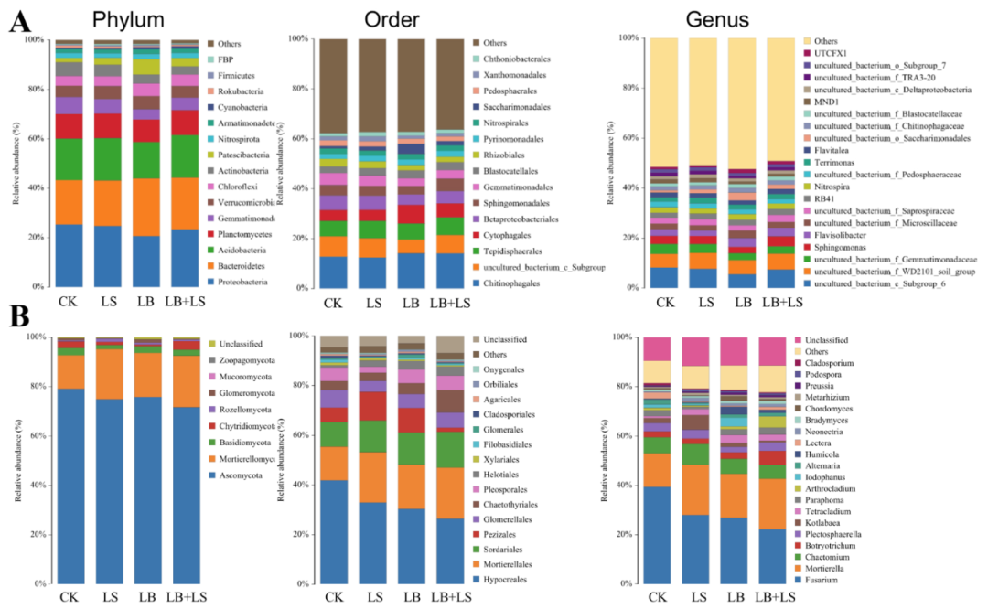 進一步分析微生物群落結構表明,16S rRNA基因序列隸屬于31門257科396屬,而ITS rRNA基因序列隸屬于8門100科170屬。圖7顯示了在群落組成中發現的15個最豐富的門和目,以及前20個屬。Proteobacteria,Bacteroidetes,Acidobacteria和Planctomycetes是所有樣品中最主要的四種細菌門(圖7A),占所有分類細菌序列相對豐度的67.8-71.68%。Proteobacteria是CK、LS和LB +LS 土壤中的主要細菌門,而Bacteroidetes?(23.4%) 是LB處理土壤中最高的門,其次是Proteobacteria?(20.6%)。這表明PGPM修正后的土壤細菌群落與蔗糖處理 (LS) 或 CK 后的土壤細菌群落顯著不同。此外,LB和LB + LS處理的樣品中Cyanobacteria的相對豐度增加,而CK和LS樣品中的Rokubacteria增加。