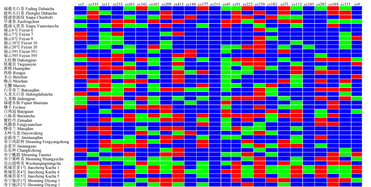篩選適宜的核心標(biāo)記位點,并將其用合適的形式展現(xiàn)出來至關(guān)重要。利用篩選得到的SNP標(biāo)記進(jìn)行品種材料的鑒定,并構(gòu)建DNA指紋圖譜。例如,玉米DNA指紋圖譜構(gòu)建研究中,利用384個?SNP?標(biāo)記組合構(gòu)建了?335?個玉米雜交種的基因型指紋圖譜,?該圖顯示每個品種的基因型組合均不同,?即?384?個?SNP?位點能夠有效區(qū)分所測試的雜交種。