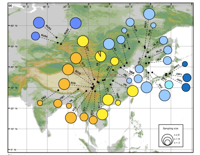 對包括地理距離、環(huán)境、氣候歷史和外部傳播在內(nèi)的潛在驅(qū)動因素分析發(fā)現(xiàn),該復(fù)合群以東亞35°N(即秦-巴山脈以北)為分界線,南北群體在遺傳、形態(tài)和生態(tài)水平上存在明顯差異。群體歷史動態(tài)和分布區(qū)模擬分析表明,由于第四紀(jì)氣候的變化,導(dǎo)致了該類群能夠從亞洲東北部向西南部遷移并定居于新的生境。此外,除了生態(tài)適應(yīng)性外,該研究還發(fā)現(xiàn)林冠郁閉度、風(fēng)向以及生境連續(xù)性都可能限制基因流的影響。這些結(jié)果為蕨類植物時空演化模式的研究提供了新的思路,強調(diào)了生境異質(zhì)性在驅(qū)動遺傳分化對強擴(kuò)散能力的影響。