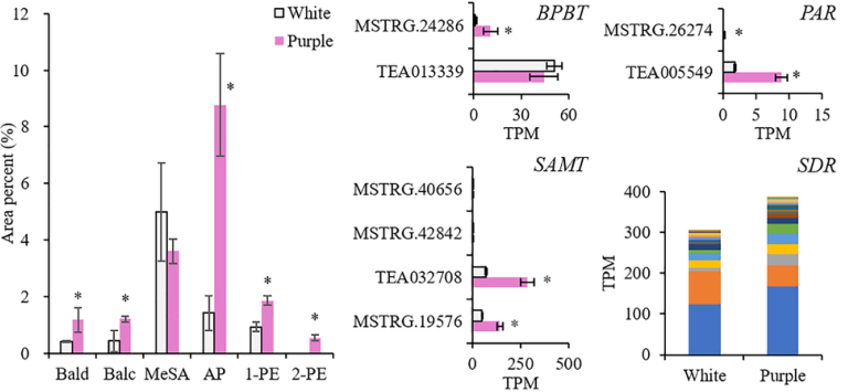 在白色和紫色茶花中,最豐富的揮發性苯化合物(BPs)是MeSA和AP、1-PE。在白色茶花中,MeSA是主要的揮發性BPs,相對于白色茶花,紫色茶花中的AP高出2倍。除MeSA外,其他常見揮發性BPs在紫色花朵中顯著升高:1-PE、Bald和Balc分別為高出2,2.9,2.8倍;而在白花中沒有檢測到2-PE。總體上,紫茶花中的BPs發生了變化,其中苯丙烷類(AP、1-PE和2-PE)高于其他苯類(Bald、Balc和MeSA),而在正常的白色花朵中,則相反,這表明紫色茶花中苯丙烷類化合物的合成途徑被促進。