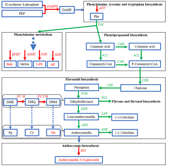 苯類化合物,尤其是苯丙烷,是植物顏色和香氣的主要來源,它們幫助植物吸引傳粉動物或阻止外敵侵害。類苯和類苯丙烷(BPs),例如類黃酮,是一組次級代謝產物,來源于莽草酸途徑中的兩種芳香族氨基酸苯丙氨酸(Phe)和酪氨酸。