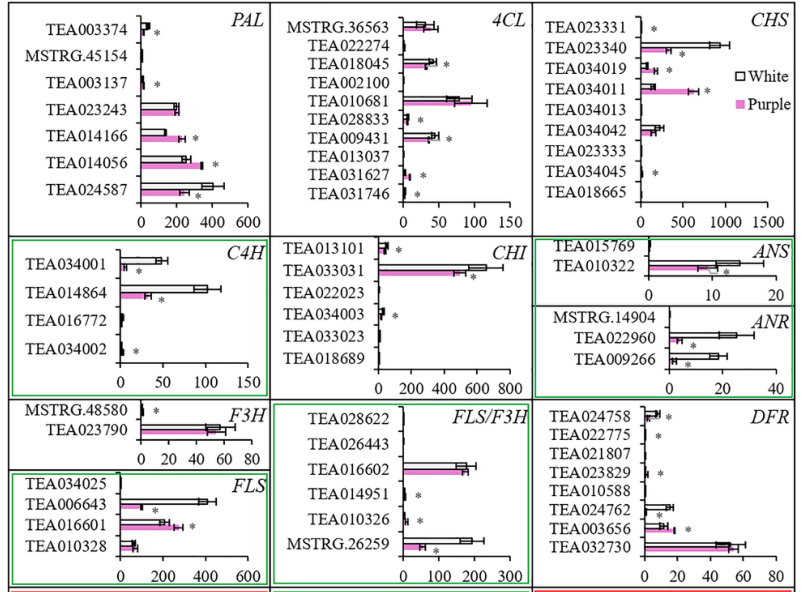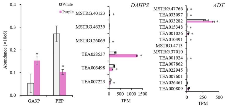 為了進一步揭示兩個茶樹品種之間BPs的不同合成機制,檢測了上游化合物和基因(圖5)。在紫色花瓣中,3-磷酸甘油醛(GA3P)增加了2.9倍,而磷酸烯醇式丙酮酸(PEP)僅為白色花瓣的38%,這表明紫色花瓣中的碳代謝被促進,但它可能不會進入苯丙氨酸的下游代謝。PEP的降低可能是由于高度誘導的3-脫氧-D-阿拉伯庚糖酸7-磷酸合成酶(DAHPS)所致。在紫色花瓣中,DAHPS基因的主要成員TEA028537的表達量高出4.6倍。芳醇脫水酶/預苯酸脫水酶(ADT)催化芳醇生成苯丙氨酸。它的主要成員TEA033282在紫色花瓣中略微升高,高出1.3倍。此外,合成的花青素在顯示顏色之前需要運輸到液泡中,該過程與谷胱甘肽S-轉移酶(GST)、多藥耐藥相關蛋白(MRP)以及多藥和毒素擠壓(MATE)有關。把這些顯著差異基因的表達量加起來,發現紫色花瓣的總表達量都較高,分別高出1.1, 1. 3和1.7倍。紫色花瓣中這三個基因的主要成員(TEA015341、TEA001531和TEA006958),表達量分別高出6.9, 1. 4,和3.9倍。