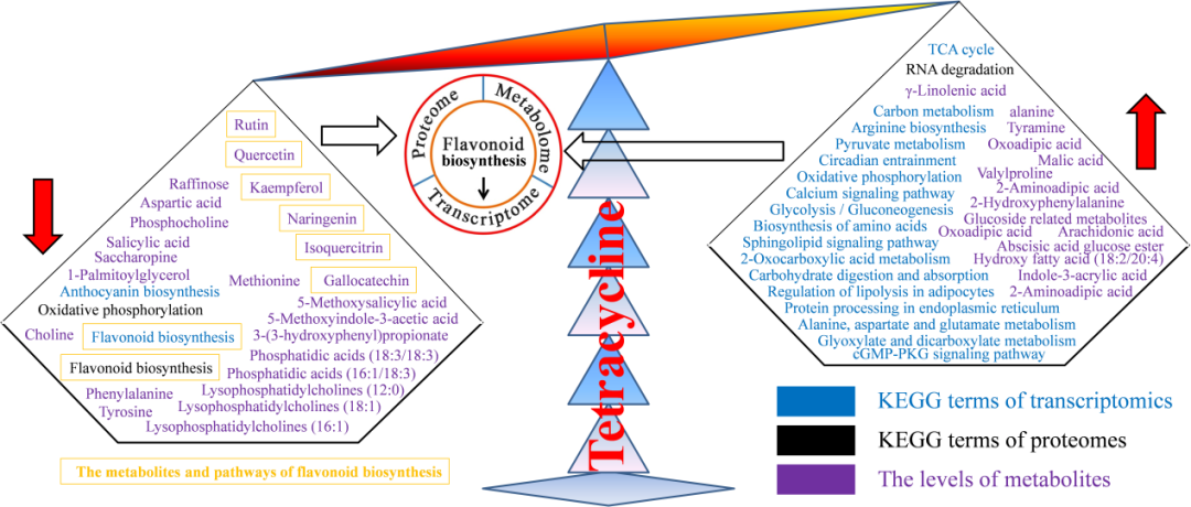 環境因素,包括抗生素,如四環素,可以改變植物的生理過程。為了了解細胞/組織對四環素的響應,采用多組學方法探討四環素影響黑麥草根系生長的分子機制。四環素引起植物根系代謝廣泛變化,特別是對類黃酮代謝途徑相關基因和代謝物的影響,揭示四環素脅迫下類黃酮的變化。本研究由百邁客提供代謝組、轉錄組和蛋白質組技術服務。