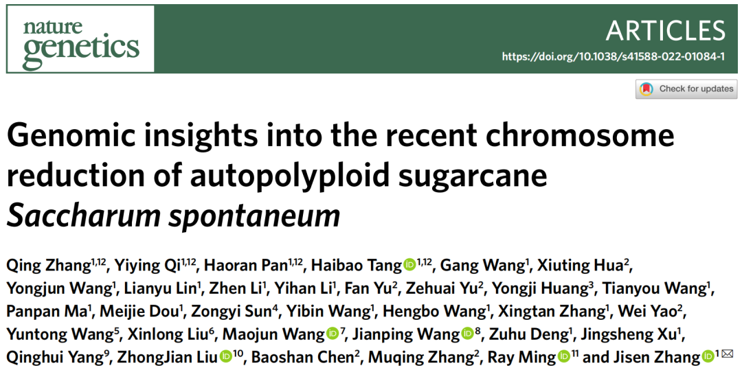 福建農林大學海峽聯合研究院基因組中心張積森課題組博士生張清(目前中國農科院深圳農業基因組研究所工作)、齊浥穎、碩士生潘浩然和基因組中心唐海寶教授為論文共同第一作者,基因組中心張積森教授為通訊作者。張積森教授團隊長期從事以甘蔗基因組學與分子育種研究,該成果是基因組中心團隊在甘蔗領域發表的第2篇Nature Genetics論文,作為近60年以來發表研究刊物高的甘蔗論文,該研究將進一步奠定我國在甘蔗基礎研究領域的學術地位。
