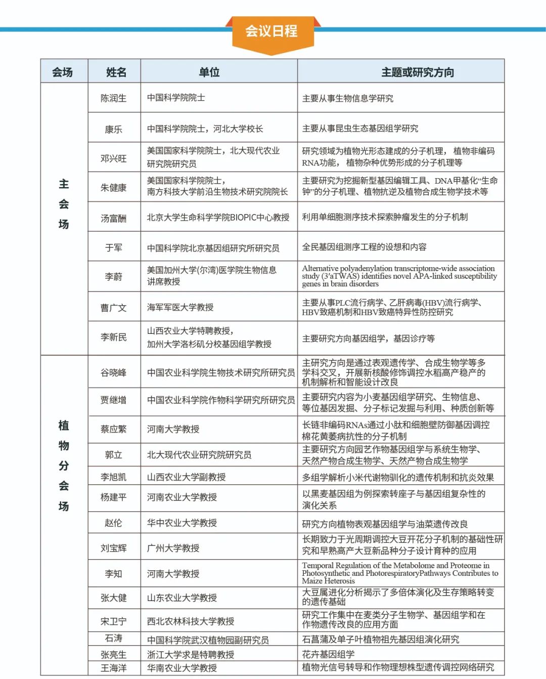 隨著基因組組裝(GA)、種質資源鑒定(GC)、基因功能鑒定(GI)、基因組育種(GB)、基因編輯(GE)的5G育種策略快速發展,以高通量測序技術為基礎的組學研究已經廣泛應用于植物研究的各個領域。本次大會特邀植物功能基因組學、系統與進化植物學、表觀遺傳學等熱點領域專家齊聚一堂,分享植物研究的前沿技術、經驗成果及發展前景。