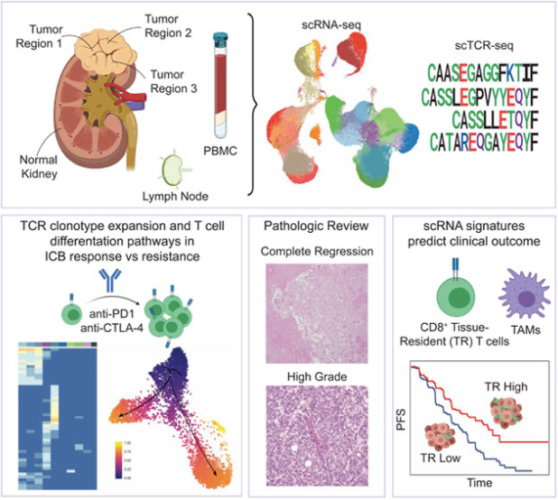 研究內容:腎透明細胞癌(CCRCC)具有高度的免疫浸潤,但免疫異質性對CCRCC臨床的結局的影響尚不完全明確。2例未接受ICB治療和4例接受ICB治療的CCRCC患者的多個腫瘤組織、淋巴結、癌旁組織和外周血的167283個細胞進行scRNA-seq和TCR-seq。患者本身和患者之間存在異質性,ICB響應患者中CD8A+組織駐留T細胞富集,抗性患者中腫瘤相關巨噬細胞(TAMs)富集。TCR軌跡分析表明對ICB響應和未響應的患者之間有不同的T細胞分化軌跡。在多個獨立隊列研究中,組織駐留T細胞和TAMs的單細胞轉錄特征與ICB和靶向治療反應相關。