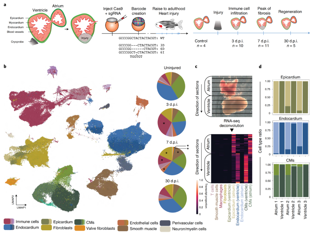 為了系統地識別健康和再生斑馬魚心臟中的細胞類型,作者對損傷前后不同階段的大約20萬個解離細胞進行了scRNA-seq(圖1a)。為了準確得到細胞發育起源的相關信息,作者還應用了一種基于CRISPR–Cas9技術的大規模平行譜系追蹤方法,通過注射Cas9和針對多拷貝轉基因(斑馬魚系中的dTomato:一種用于斑馬魚細胞追蹤和譜系分析的多光譜細胞標記)的sgRNA,創建了作為譜系條形碼的“遺傳疤痕”來記錄早期發育中的譜系關系。