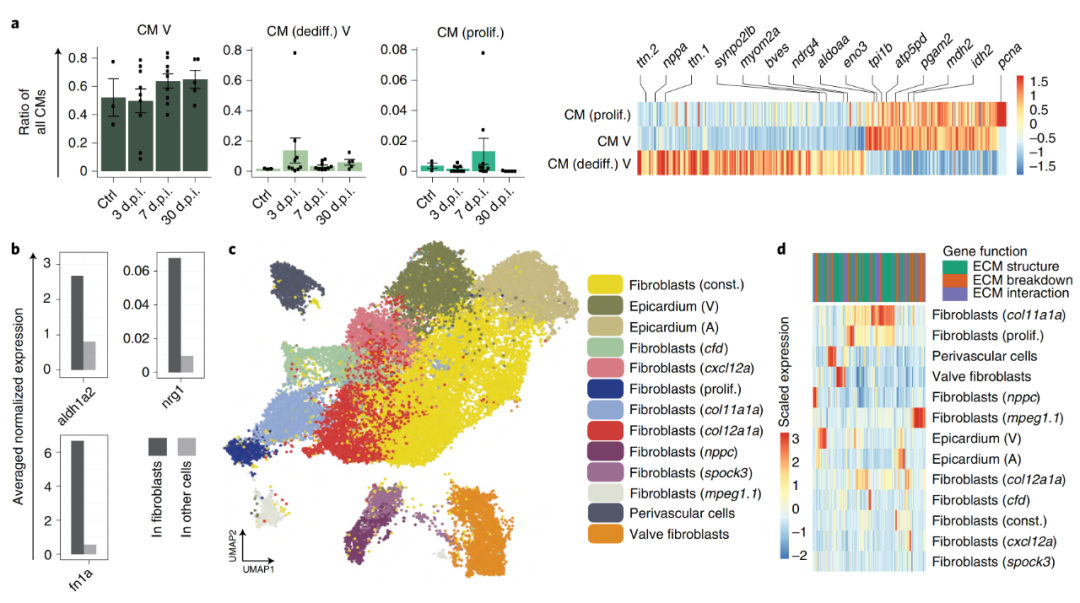 作者注意到心臟再生中三個成熟的信號因子在成纖維細胞中高度富集:合成視黃酸的酶aldh1a2、心肌細胞有絲分裂原nrg1和再生細胞外基質(ECM)因子fn1a(圖2b)。為了更詳細地研究心臟成纖維細胞的多樣性,作者對成纖維細胞進行了亞群聚類。結果顯示出驚人的多樣性,有13個轉錄上不同的成纖維細胞聚類(圖2c)。這13個基因簇在ECM相關基因的表達譜上表現出明顯的差異(圖2d),但它們的轉錄組多樣性遠不止于此——去除ECM相關基因后,可以高精度鑒定相同的成纖維細胞亞型。