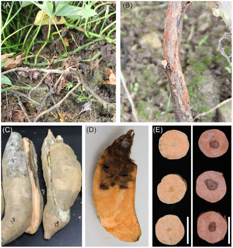 圖 1 大田感染 FRST 的甘薯植株表型。 (A)受感染的莖和葉。(B)覆蓋基部莖的帶紅色外皮。(C和D)受感染的貯藏根。(E)在致病性測試中接種 CRI 24-3 (右) 和陰性對照 (左) 的貯藏根。標尺 = 5 厘米。