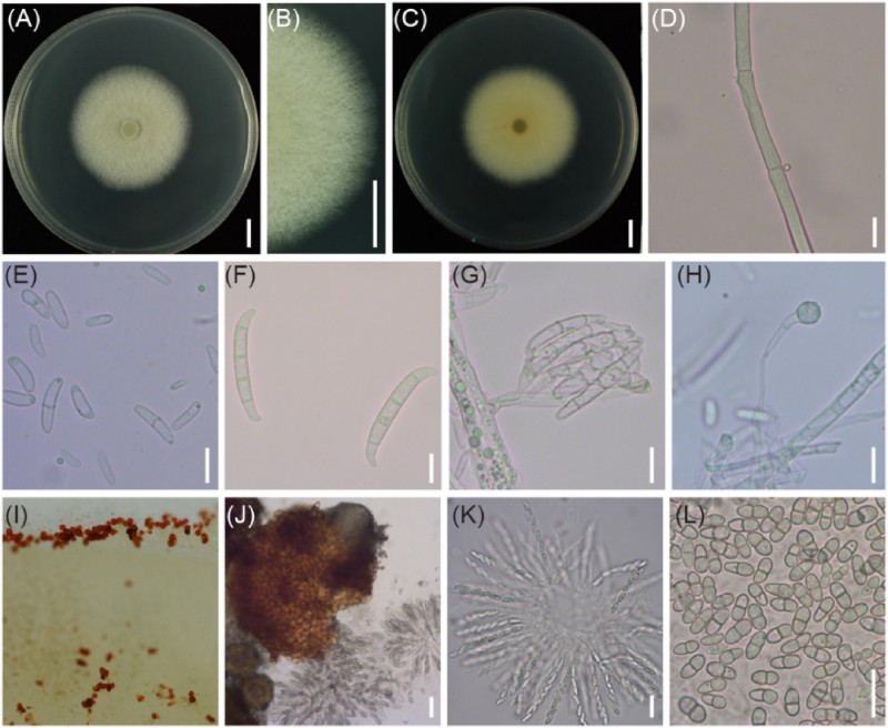 圖2 CRI 24-3在PSA上的形態特征。 (A 到 C) 培養 4 天后從表面和背面的菌落。標尺 = 1 厘米。(D) 氣生菌絲。(E) 小分生孢子。(F) 大分生孢子。(G) 假頭中的分生孢子。(H) 衣藻。標尺 = 10 微米。(I)Perithecia。(J) 放大的外皮層。標尺 = 50 微米。(K) 子囊軸承 (L) 八個子囊孢子。標尺 = 20 微米。