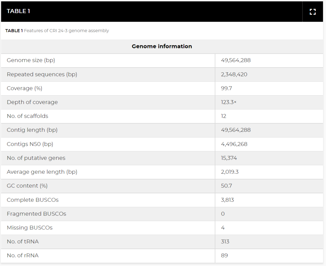 經數據質控后共獲得 452,011 條高質量的clean reads(平均長度 13,525.1 bp)(表 S1)。CRI 24-3的 49.6 Mb 基因組是由 12 個contigs產生的,該基因組具有 4.5 Mb 的contigs N50 和 50.7% 的 GC 含量,覆蓋深度估計為 123.3 倍(圖 3;表 1)。基因組質量評估結果表明,CRI 24-3 的基因組組裝完整且準確,因為 CRI 24-3 中的單拷貝直系同源基因與 sordariomycetes_odb10 數據集中所有 3,817 個完整核心基因的 99.9% 匹配(表 1)。