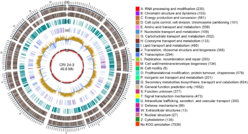 圖 3 CRI 24-3 基因組組裝圈圖。 (A) 12 個contigs的物理位置。標尺?= 1 kb。(B 和 C)具有 KOG 類的正向和反向鏈上的蛋白質編碼基因。(D)?重復序列。(E)?正向鏈上的 tRNA(藍色)和 rRNA(紫色)編碼基因。(F)?某些區域的 GC 含量高于(黃色)或低于(藍色)平均基因組 GC 含量。(G) GC-skew = (G?C)/(G+C),具有正(黑色)或負(紅色)值。