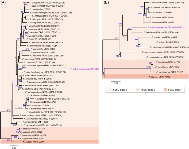 圖 4 CRI 24-3 和其他植物病原鐮刀菌的系統發育分析。 從?(A) ITS、RPB2 和 TEF 1-α 的串聯序列和 (B) 由 16 個 FSSC 物種共享的 1,544 個單拷貝同源基因的組合序列推斷出的 ML 樹。?引導值(藍色)表示相關菌株聚集在一起的分支百分比。?括號中的阿拉伯數字區分了 FSSC 進化枝 3 中系統發育不同的物種。