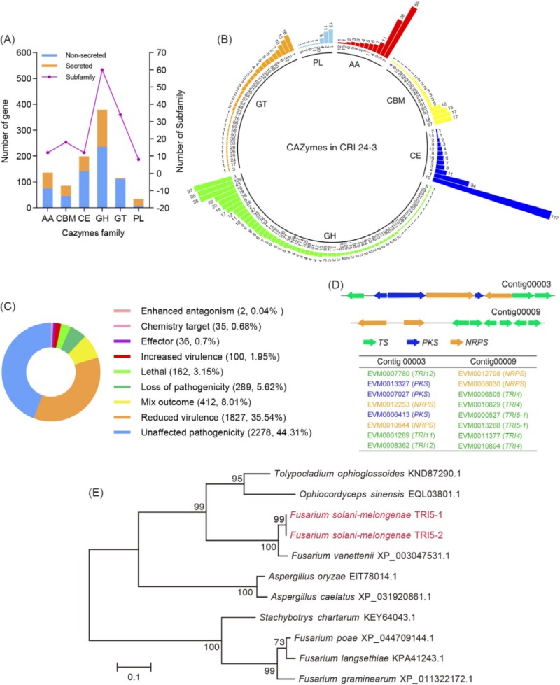 圖 5 CRI 24-3 蛋白質組中的 CAZymes 和 PHI 蛋白。 (A) CAZymes 及其相關家族的數量。?(B) CAZymes 家族分布。?內圈附近和條形頂部的數字分別代表家族 ID 和蛋白質的數量。AA:輔助活性,CBM:碳水化合物結合模塊,CE:碳水化合物酯酶,GH:糖苷水解酶,GT:糖基轉移酶,PL:多糖裂解酶。?(C) 5141 PHI 蛋白的功能。?混合結果表明在一種蛋白質中觀察到至少兩種不同的功能。?(D) 編碼 PKS、NRPS 和 TS 的串聯陣列基因聚集在 CRI 24-3 組裝的 Contig00003 和 Contig00009 中。?(E) 從 CRI 24-3 和其他相關物種的 11 條單孢菌素合酶序列推斷的系統發育關系分析。