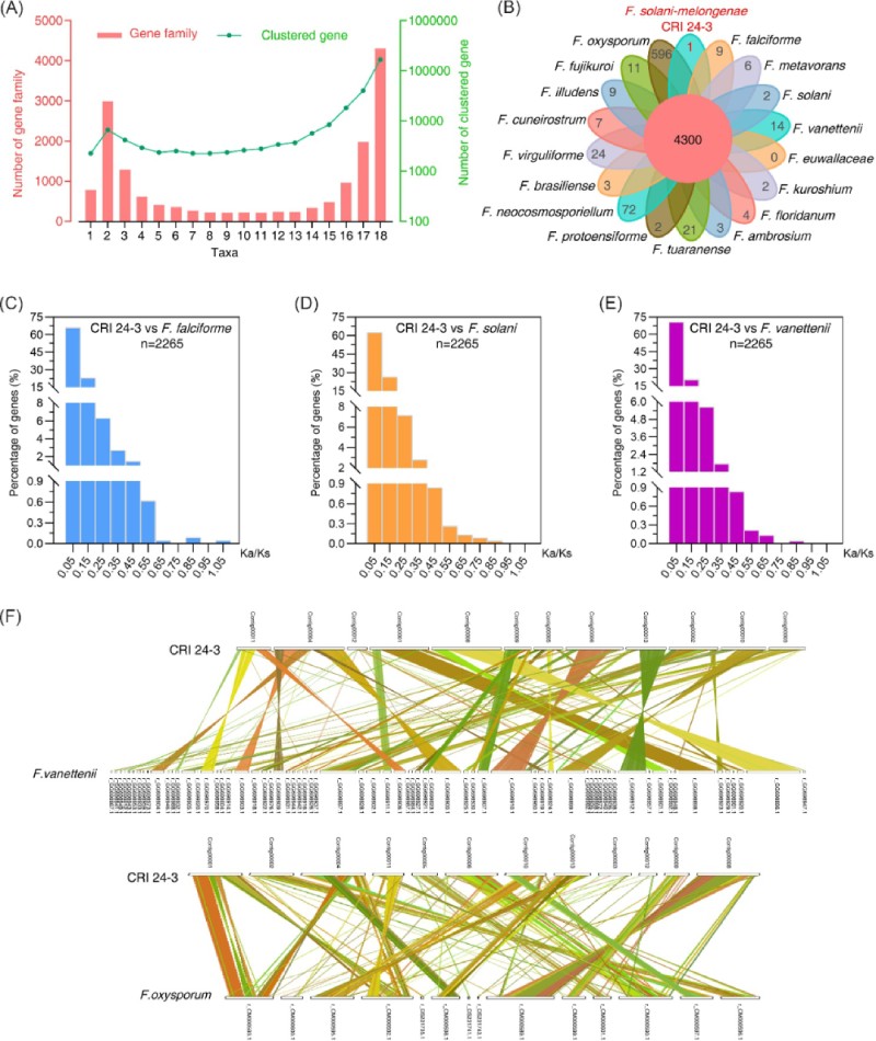 圖6 CRI 24-3與其他鐮刀菌的基因組比較分析。 (A)基因家族和聚集在相應家族中的基因數量從1到18不等。(B)花形維恩圖。?中心值表示 18 個鐮刀菌屬中所有共有基因家族的數量;?花瓣的值表示每個物種中特有基因家族的數量。?(C 到 E)CRI 24-3 和?F. falciforme、F. solani、F. vanettenii?之間基因對的 Ka/Ks 比率分布。?小寫字母“n”后面的值表示所有檢測到的基因對的數量。?(F) 顯示基因組共線性的雙同線性圖。?不同顏色的線用于連接 CRI 24-3 和?F. vanettenii?(頂部) 或?F. oxysporum?(底部) 之間的直系同源基因對。