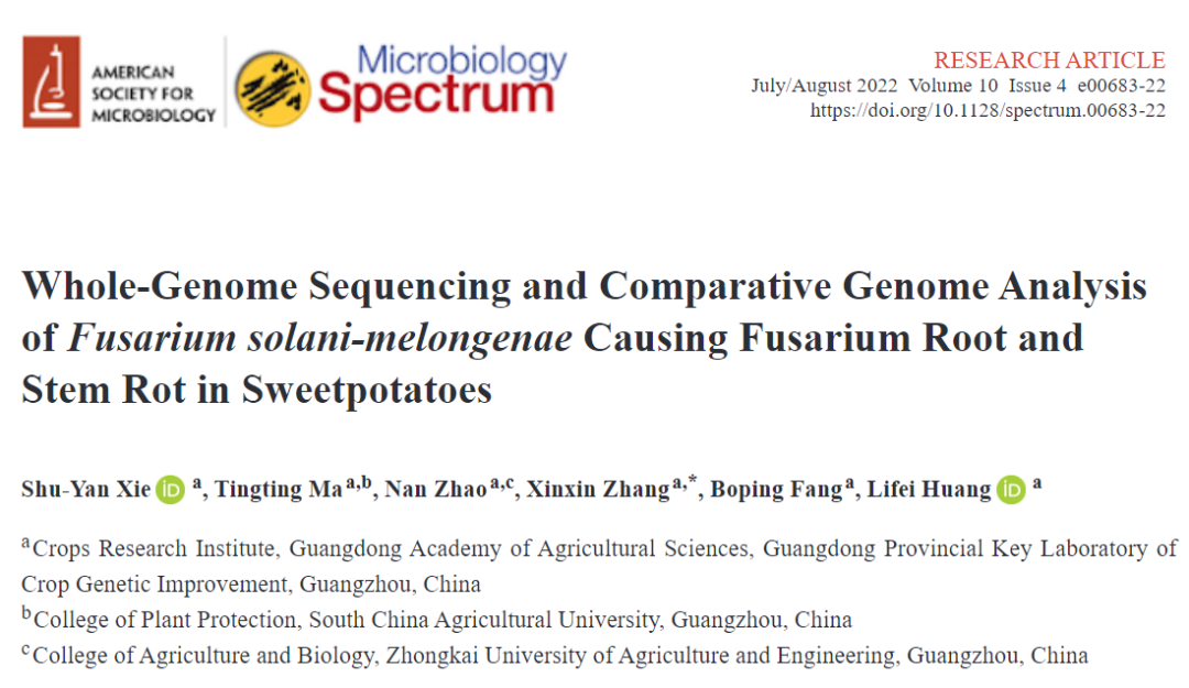 近日, Microbiology Spectrum(IF 9.0431)在線發表了廣東省農科院作物所黃立飛副研究員、房伯平研究員為通訊作者的研究論文 “Whole-Genome Sequencing and Comparative Genome Analysis of?Fusarium solani-melongenae?Causing Fusarium Root and Stem Rot in Sweetpotatoes”,該研究報道了F. solani-melongenae?分離株 CRI 24-3 的全基因組組裝序列,并且深入探討其功能基因信息,為其他密切相關的鐮刀菌屬物種的基因組研究提供基礎,通過比較基因組分析促進了對鐮刀菌基因組特征和進化關系的整體理解。百邁客有幸參與此項研究工作,對該真菌全基因組進行測序組裝注釋和比較基因組分析。摘要