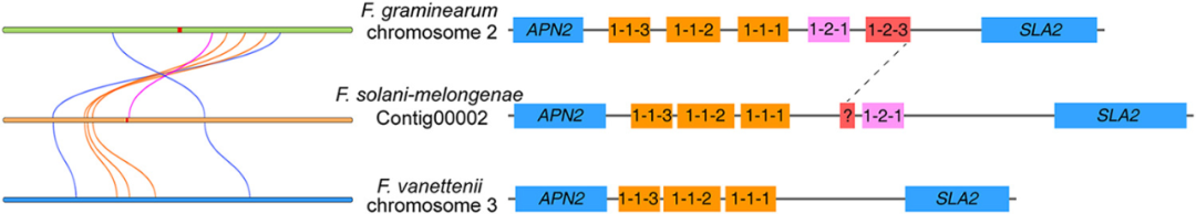 其他三種密切相關的 FSSC 物種F. falciforme、F. solani和F. vanettenii的基因組被用作參考基因組來探索 CRI 24-3 的選擇壓力。分別確定了 CRI 24-3 與?F. falciforme、F. solani?和F. vanettenii?之間的 2265、2272 和 2272 直系同源物對的非同義替換率 (Ka) 與同義替換率 (Ks) 的比率( 圖 6C 至 E)。Ka /Ks總體分析的值小于 1,表明 CRI 24-3 中的大多數直系同源物似乎都經過了純化選擇并且高度保守。然而,CRI 24-3 和F. falciforme基因組的比較確定了一個快速進化基因對(EVM0014458.1 與 GE10416_g)的 Ka /Ks比率大于 1,表明陽性選擇可能發生在進化。基因組共線性分析表明,F. vanettenii和F. oxysporum基因組中的幾個染色體片段在 CRI 24-3 中濃縮成一個片段,并有一些倒位(圖 6F )。此外,CRI 24-3 中的一些直系同源物具有多對一的關系。CRI 24-3 中至少有兩個查詢基因與參考物種中的相同直系同源物匹配。值得注意的是,CRI 24-3 的重要基因組區域不能與尖孢鐮刀菌基因組中的那些共線性耦合,由 35.9% 的共線性率(共線直系同源物對與所有直系同源物對的比率)支持,該比率低于CRI 24-3 和F. vanettenii?(77.6%)。結果表明,CRI 24-3在系統發育上與尖孢鐮刀菌相距較遠。MAT基因座對于在鐮刀菌屬中產生子囊孢子至關重要。在此,交配型結構組織 ( MAT ) 基因座在基于簡化的共線性分析比較了茄科鐮孢菌CRI 24-3、禾谷鐮刀菌PH-1 和F. vanettenii?77-13-4(圖 7)。與僅攜帶 MAT1-1 基因的?F. vanettenii?77-13-4相比, CRI 24-3 含有MAT1-1和MAT1-2獨特型基因,在單個MAT基因座處與禾谷鐮刀菌密切相關,除了 CRI 24-3 是 MAT1-2-3 缺陷型。只有位于 CRI 24-3 中 MAT1-2-1 上游區域的沒有任何特征功能域的片段與禾谷鐮刀菌中的 MAT1-2-3 具有序列相似性。
