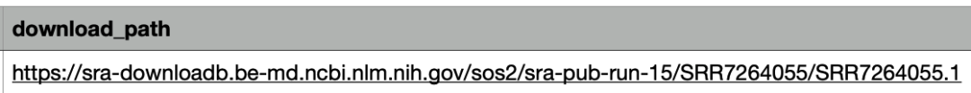 這里面包含了這個(gè)樣本的基本信息,包括測(cè)序平臺(tái)、文庫(kù)類型、數(shù)據(jù)量等基本信息,然后點(diǎn)擊頁(yè)面右上方的Send to按鈕,選擇File,F(xiàn)ormat選擇RunInfo,然后點(diǎn)擊Creat file下載一個(gè)csv文件,打開(kāi)文件,可以看到一個(gè)下載鏈接