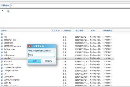 連接成功后,在遠程站點下的文件名展示中創建自己的文件,在fasp目錄下面創建自己的目錄(當然也可以與fasp目錄同級下創建),例如ABC,創建方法為點擊鼠標右鍵,會出現下圖中的創建空文件夾對話框,輸入自己文件夾的命名,之后點擊確認,這樣你的文件夾就創建成功了。