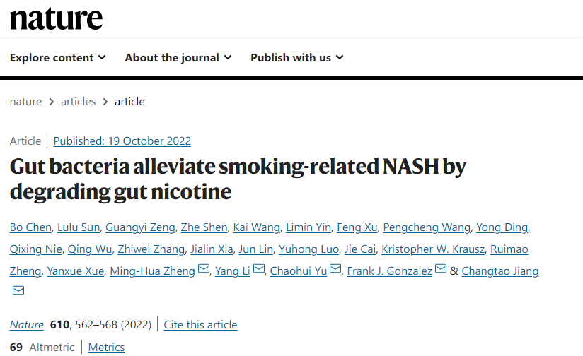 2022年10月19日,北京大學醫學部姜長濤團隊聯合美國國立衛生研究院、浙江大學醫學院、復旦大學基礎醫學院和溫州醫科大學的研究團隊在國際期刊《Nature》雜志在線發表了題為“Gut bacteria alleviate smoking-related NASH by degrading gut nicotine”的重磅研究。該研究解析了腸道尼古丁積累在非酒精性脂肪性肝炎進展中的作用,發現了人類腸道中一種能夠代謝尼古丁的內源性細菌,并提出了一種可能的減少吸煙加劇NAFLD進展的途徑。百邁客為該研究提供了宏基因組測序服務。