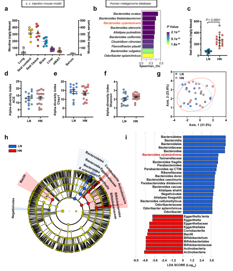 圖 1.鑒定腸道尼古丁積累和腸道細菌介導的的腸道尼古丁降解。