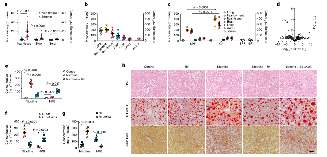 該研究發現尼古丁在吸煙期間在腸道中積聚并加速NAFLD的進展,但它可以被人類共生菌B. xylanisolvens 有效降解。揭示了了腸道尼古丁積累的病理影響,并確定了一種內源性尼古丁降解腸道細菌,該細菌對預防和治療吸煙者的 NASH 具有潛在價值。