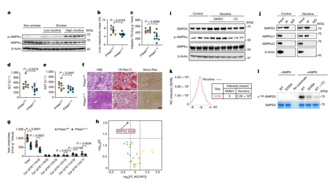 總之,尼古丁誘導的腸道AMPKα-SMPD3軸的激活通過增加腸道神經酰胺的產生來促進非酒精性脂肪肝的進展,因此抑制SMPD3是一種潛在的緩解肝臟脂肪變性、炎癥和纖維化的策略。