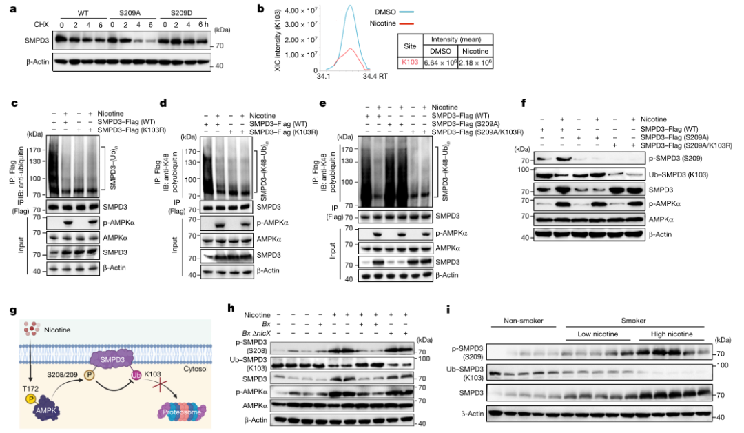 此外,在尼古丁處理的SW480細胞中,SMPD3在Lys103處的去泛素化程度顯著高于DMSO處理的細胞(圖3B和擴展數據圖6G)。通過免疫沉淀,我們發現泛素化的SMPD3(Lys103)主要包含經典的Lys48-連接Ub鏈(Lys48-Ub),而不是Lys63-Ub,后者被尼古丁處理減少(圖3C,d和擴展數據圖6h)。S209A突變逆轉了尼古丁誘導的SMPD3 Lys48-Ub的減少,K103R突變進一步緩解了這一下降(圖3e和擴展數據圖6i)。此外,開發了抗p-SPMD3(S209)和抗Ub-SMPD3(Lys103)抗體(擴展數據圖6J,k),并證實尼古丁誘導的總SMPD3蛋白的增加是由于SMPD3磷酸化水平升高,隨后泛素化減少(圖3F)。