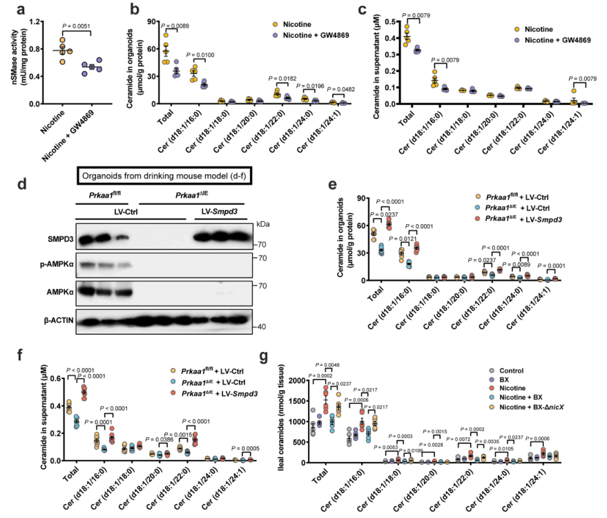 SMPD3被認為是代謝性疾病的病理加速器。將SMPD3抑制劑GW4869應用于有機化合物以抑制SMPD3活性。GW4869降低了尼古丁處理下類器官及其上清液中的神經酰胺水平。慢病毒表達的SMPD3被用于從尼古丁飲用模型恢復Prkaa1基因敲除的回腸器官中SMPD3的表達。正如預期的那樣,SMPD3的過表達逆轉了由于回腸器官中AMPKα1缺乏而導致的神經酰胺水平的降低。在尼古丁加速的NASH小鼠模型中,在B. xylanisolvens存在的情況下,被B.xylansolvens定植的SPF小鼠回腸神經酰胺減少,這是由于腸道p-AMPKα-SMPD3軸被抑制所致。