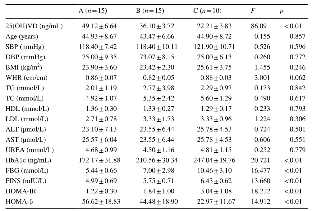 表1顯示了三組人體樣本的一般信息。比較了三組的一般數據,發現三組之間在年齡、SBP、DBP、BMI、WHR、TC、TG、HDL、LDL、ALT、AST和尿素方面沒有顯著差異(p>0.05)。隨著維生素D含量的降低,HbA1c、Fbg、FINS和HOMA-IR水平升高,而HOMA-β水平則相反。這些結果表明,維生素D缺乏導致血糖水平升高和胰島素抵抗。